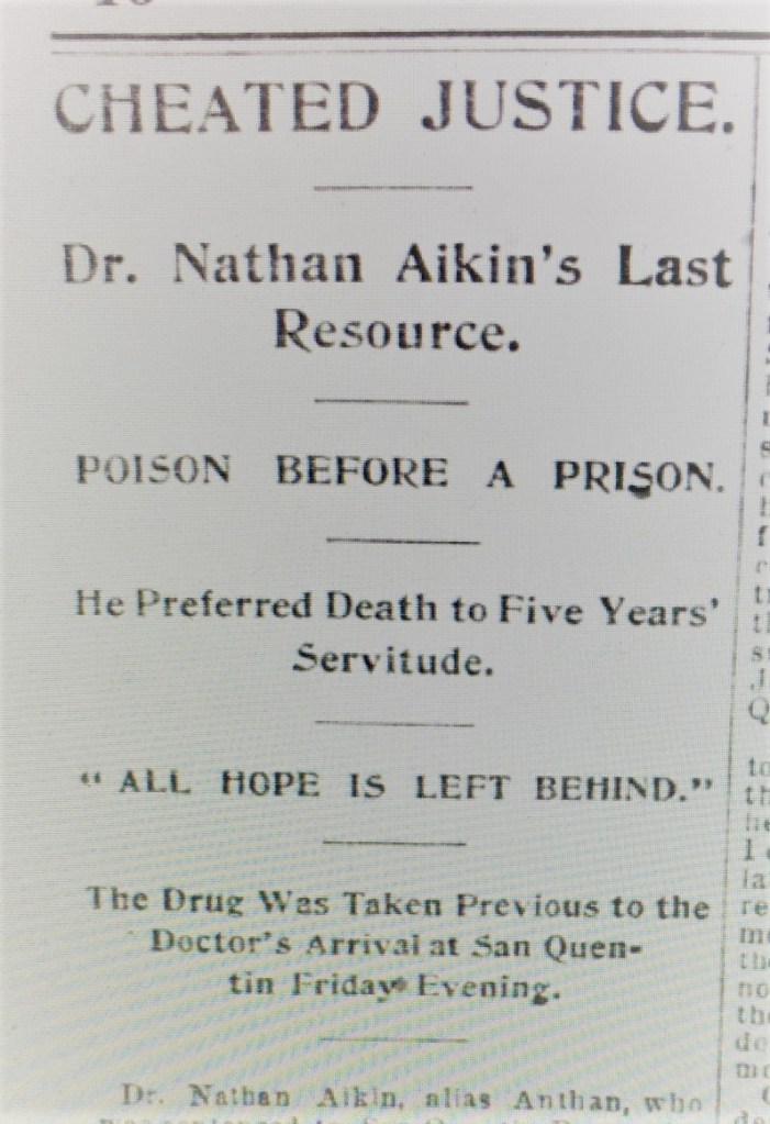And Dr. Aiken? Well, his life story didn’t get much better after his infamous firsts in 1878. He relocated to Michigan and was a defendant in an 1886 criminal trial for manslaughter stemming from the death of a patient in an abortion case. Then he moved to California, gained a medical license and apparently thrived for a while despite periodic legal troubles starting with an extortion case. He later committed suicide (poison) in route to San Quentin prison. A press report identified him as a “notorious abortionist” convicted for using the U.S. mail to solicit criminal abortion.