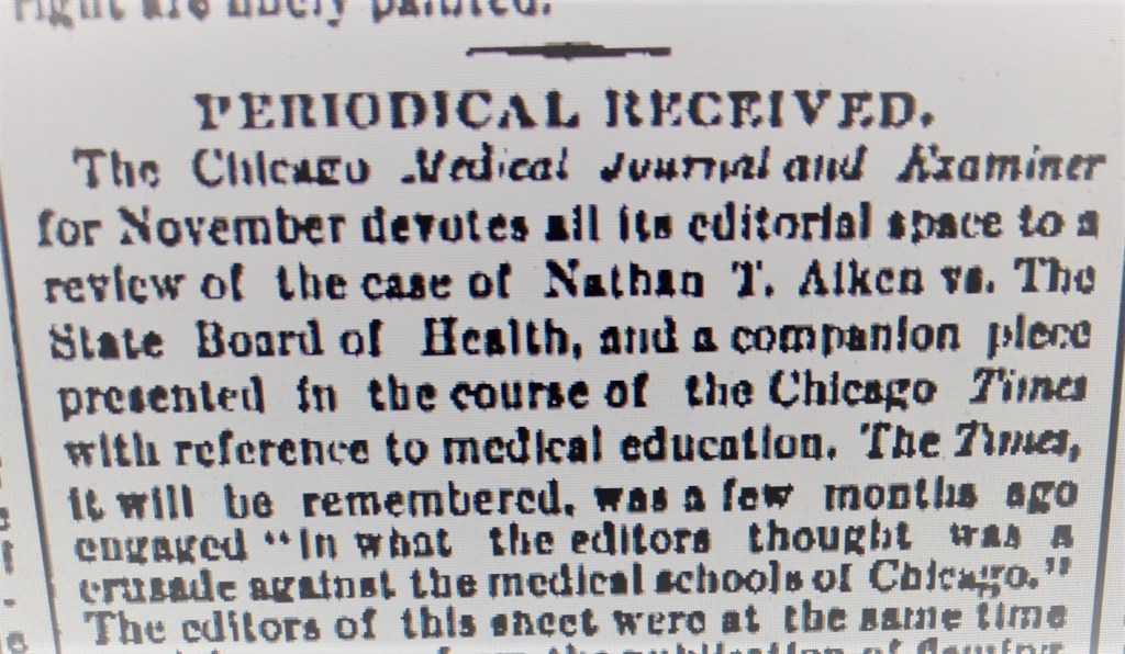 Take the case of Dr. Nathan J. Aiken. We don’t know much about him. He was born ca. 1840 in New York state, may have taught school briefly and graduated from the Cincinnati College of Medicine and Surgery in 1865. He entered the historical record in September 1878 in Aiken v. State Board of Health [Illinois].