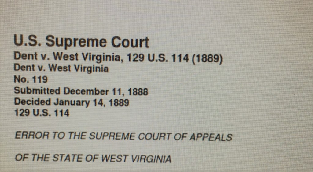 These are the facts of Dent. The West Virginia legislature established a State Board of Health in 1881. Along with the usual scope of powers (e.g., sanitary investigation, monitoring water quality, sewage) the board received statutory authority to license individuals for the practice of medicine. Licenses could be obtained by any of three methods: medical degree from a “reputable medical college,” practicing within the state for the prior ten years or passing the board’s licensing exam.