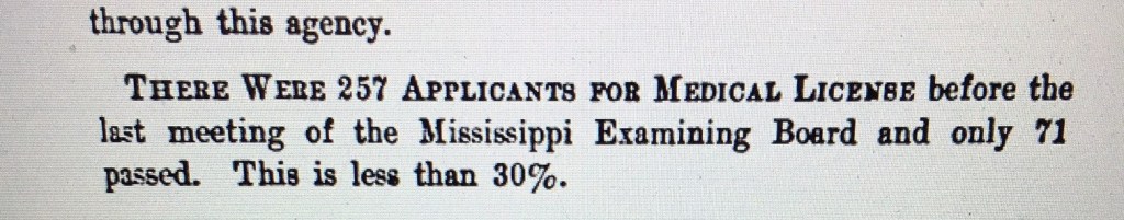 Black physicians of this era viewed state licensing exams cautiously and with an understandable degree of skepticism. Who wouldn’t wonder what kind of standard was being applied when the New Orleans Medical and Surgical Journal reported that 70% of the 257 applicants for licensure failed Mississippi’s exam in summer 1907 and then nearly 80% passed in December?