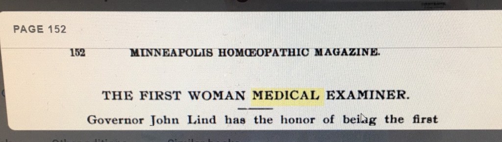“The First Woman Medical Examiner,” Minnesota Homeopathic Magazine, Vol 8, no 5, 1899, page 152