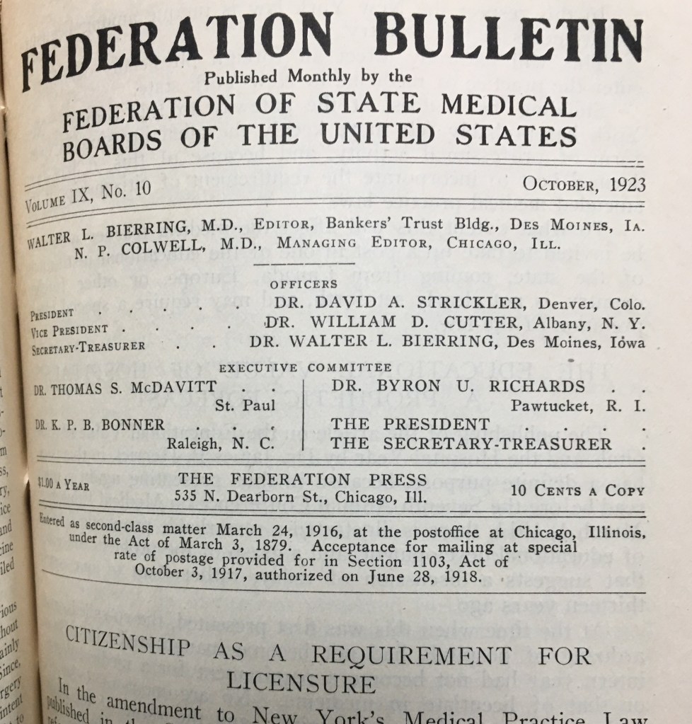 As the primary communication tool among and between state medical boards, the Federation of State Medical Boards’ monthly Bulletin offers a unique look into this deteriorating regulatory landscape in the 1920s. For the first time, inflammatory language began to appear in the Federation Bulletin with phrases like “alien invasion” and “undesirable foreign applicant” entering its editorial pages.
